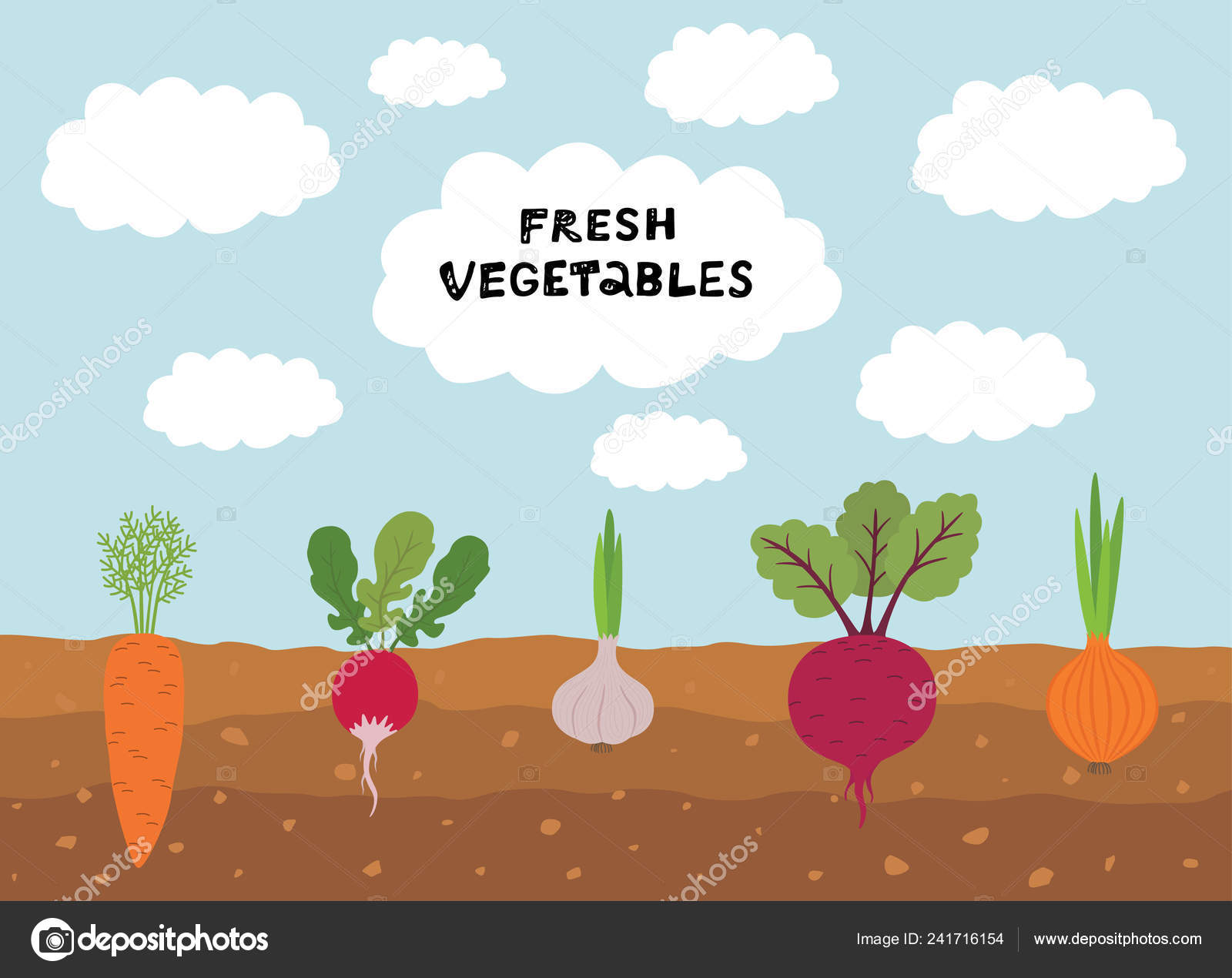Fresh Organic Vegetable Garden On Blue Sky Background Set